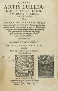 OPERA & STUDIO IOHANNIS HENRICI ALSTED I., NE SUTOR ULTRA CREPIDAM, ACCESSIT NOVUM SPECULUM LOGICES MINIME VULGARIS. Argentorati [Strasburg]: Lazari Zetzneri, 1609. 8º. 4 h. + 183 p. (falta la 27-28, expurgada por la Inquisición). Figuras geométricas en el texto. Enc. en pergamino de la época. Primera edición muy rara. Ejemplar en la Biblioteca Nacional de París, y en León (España).