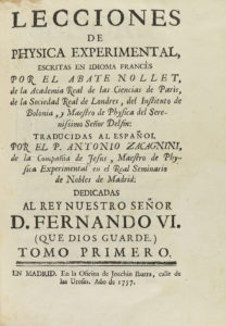 1757. (CIENCIAS-FÍSICA). NOLLET, ABAD [JEAN-ANTOINE]: LECCIONES DE PHYSICA EXPERIMENTAL. TRADUCIDAS AL ESPAÑOL POR EL P. ANTONIO ZACAGNINI... DEDICADAS AL REY NUESTRO SEÑOR D. FERNANDO VI. TOMO PRIMERO [AL VI]. Madrid: Joachin Ibarra, 1757. 6...
