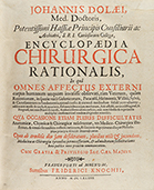 1689. LIBRO: (MEDICINA-CIRUGÍA). DOLAEI, JOHANNIS: ENCYCLOPAEDIA CHIRURGICA RATIONALIS, IN QUA[M] OMNES AFFECTUS EXTERNI CORPUS HUMANUM UNQUAM INVASISSE OBSERVATI... Francofurti ad Moenum (Franfort de Meno): Frieserici Knochii, 1689. 8º mayor. 18...