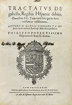 1594. LIBRO: (DERECHO TRIBUTARIO). GARCIA GIRONDA: TRACTATUS DE GABELLIS, REGIBUS HISPANIAE DEBITIS. Madriti: apud viduam Petri Madrigal, 1594. 4º mayor. 6 h. + 222 p. + 34 h. Escudo xilográfico en la portada. Marca de anterior poseedor. Puntos de...