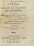(inclusive una página con el escudo de armas de los Martel grabado en madera) + 108 p.+ 4 hs. Enc. de la época en pergamino flexible con título rotulado en el lomo. Muy buen ejemplar, salvo la portada que está reforzada y con una sombra antigua de mancha de agua. Edición original en una emisión distinta de la conocida que se encuentra junto al tratado de Blancas, ´Coronaciones de los Serenissimos Reyes de Aragón´. Interesante tratado del ceremonial y protocolo que debe de usarse durante la constitución de las Cortes, a difererencias de los Actos; en sus 84 capítulos se describen las obligaciones de los estamentos, caballeros, hidalgos, delegados reales, eclesiásticos vigentes en las Cortes de 1535 (Monzón) y 1592 (Tarazona), incluye esquemas de situación física en las salas. Muy interesante. Palau 153152.