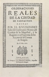 [1696]. LIBRO: (DERECHO-BARBASTRO). MONTER, SEGISMUNDO: ORDINACIONES REALES DE LA CIUDAD DE BARBASTRO. HECHAS POR EL ILUSTRISSIMO SEÑOR [...] DEL CONSEJO DE SU MAGESTAD, Y SU REGENTE EN EL SUPREMO DE LOS REYNOS DE LA CORONA DE ARAGÓN. EN EL AÑO...