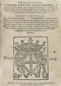 1704. LIBRO: (DERECHO CATALÁN). ORDINACIONS, Y CRIDAS FETAS PER LO ILLUSTRISSIM, Y FIDELISSIM CONSISTORI, DELS SENYORS DEPUTATS, Y OYDORS DE COMPTES DEL GENERAL DEL PRINCIPAT DE CATHALUNYA, Y SOS COMTATS: DE CONSELL, Y PARER DELS NOBLES, Y MAGNIFICS...