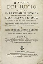 1781. LIBRO: (DERECHO-GRANADA). RAZON DEL JUICIO SEGUIDO EN LA CIUDAD DE GRANADA ANTE LOS ILUSTRISIMOS SEÑORES DON MANUEL DOZ, PRESIDENTE DE SU REAL CHANCILLERIA: DON PEDRO ANTONIO BARROETA Y ANGEL, ARZOBISPO QUE FUE DE ESTA DIOCESIS; Y DON ANTONIO...