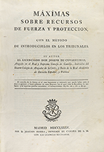 1785. LIBRO: (DERECHO). COVARRUBIAS, JOSEPH: MÁXIMAS SOBRE RECURSOS DE FUERZA Y PROTECCION, CON EL MÉTODO DE INTRODUCIRLOS EN LOS TRIBUNALES. Madrid: Joachin Ibarra, 1785. 4º menor. 2 h. + VIII + 440 p. Ligera señal de óxido. Enc. en pergamino...