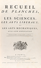 1765. LIBRO: (CIENCIAS-GRABADOS). RECUEIL DE PLANCHES, SUR LES SCIENCES, LES ARTS LIBÉRAUX, ET LES ARTS MÉCHANIQUES, AVEC LEUR EXPLICATION. TROISIEME LIVRAISON. Paris: Chez Briasson; David; Le Breton; Durand, 1765. folio mayor. Portada con marca...