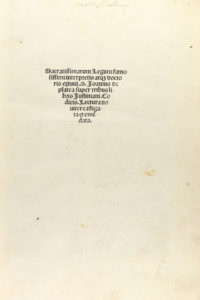 (índices) 1 h. b., con nuevo índice manuscrito del siglo XVI. Marca del impresor grabada en madera al final de la obra. Tipografía gótica. Texto a dos columnas. Letras capitales xilográficas de diversos tamaños. Magnífica impresión y bello ejemplar impreso en grueso papel de hilo. Anotaciones manuscritas y subrayados de la época (s.XVI). Enc. del siglo XIX, en pergamino y cartoné forrado de papel marbelado. Algunos taladros de polilla, rellenados de antiguo. Una de las ediciones más antiguas impresas en Lyon, sobre los tres libros: X, XI y XII, del Codex Justiniano. Colofón al dorso del folio CXLVI ´... Impressa Lugduni per magistrum Nicolaum de Benedictis. Anno dni. M.cccccviii. die x.mensis Januarii´. Ejemplar en la biblioteca de la Universidad de Oxford.