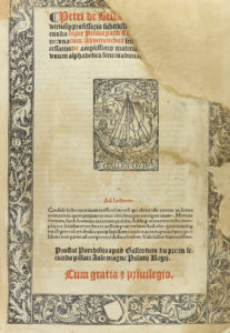 FUGITIVIS.- DE VIDICATA LIBERTATE.- DE INTERDICTIS.- DE HIS QUI ACCUSARE NON POSSUNT. Paris: Galleotum du Pre, 1519. Folio menor. Gótico. 2 h.+ 407 fol. + 1 h. de tabla. 78 líneas. Cientos de letras capitales xilográficas. Texto a dos columnas. Portada a dos tintas y con orla grabada en madera además del bello grabado de la marca del impresor. Al dorso de la segunda hoja, grabado en madera que representa a Justiniano con su corte, y sentados cuatro reyes y tres obispos, orla alrededor. A la portada le falta parte de la esquina superior, afecta el título, restauraciones en los márgenes sin afectar las últimas hojas. Impreso sobre grueso papel. Rara y bella edición gótica. Petrus de Bellapertica, uno de los precursores del ´mos italicus´ en la Universidad francesa de Orléans. Fue un jurisconsulto francés del s. XIII. Pertenece a la escuela de Jacques de Revigny; durante muchos años fue profesor en Toulouse y Orleans, ciudad en la que escuchó sus lecciones Cino da Pistoia. Desempeñó importantes cargos, entre ellos el de consejero del rey Felipe el Hermoso y el de canciller de Francia, desde 1306.