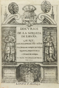 Texto con apostillas marginales. Ilustr. con varios grabados en el texto, capitales y culs-de-lampe xilografiados. Mínimas restauraciones en el margen superior de las primeras 8 h. Enc. en pasta española de época, lomera cuajada, tejuelo, cortes pintados. PRIMERA EDICIÓN. Bernabé Moreno de Vargas (Mérida, 1576-1648) estudió en Salamanca leyes, 1616 ocupó el cargo hereditario de regidor perpetuo de Mérida. En esta obra trata de los orígenes y formación de la nobleza española: explica cuál es el origen de la nobleza, las diversas formas de adquirir la hidalguía, la distinción entre infanzones, hijosdalgo, gentilhombres y escuderos, y entre hijosdalgos de sangre y de privilegio, el linaje, sus exenciones, etc... Analiza el orden que deben guardar los nobles, la forma de los escudos de armas, cómo grabar los blasones o conservar las armas ´sin mezcla de otras´, entre otros conceptos heráldicos. Palau 182382. Salvá 3580. CCPB 33505-3.