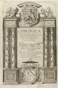 RVDO. SEÑOR DON MELCHOR DE MOSCOSO Y SANDOUAL OBISPO DE SEGOVIA. [SIGUE:] COMIENZA EL CRONICON UNIVERSAL DESDE LA CREACION DEL MUNDO HASTA AORA, DIVIDIDO EN 20. PARTES. LA PRIMERA PARTE LLEGA HASTA LA VOCACION DE ABRAHAM, Y CONTIENE 2022. AÑOS. Madrid: Luis Sanchez impresor del Rey N.S., 1624. 4º mayor. 5 h. (inclusive portada).+ 218 fol. Magnífica portada grabada al cobre, encabezada por Santo Domingo y emblemas de la Orden, de estilo arquitectónico, al pie el escudo del Obispo de Segovia, ligeramente restaurado. Letras capitales xilográficas, texto a doble columna. Algunos pliegos amarronados. Enc. de la época en pergamino con el título rotulado en el lomo. Edición original. Palau 147638.