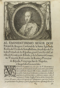 sello húmedo y antigua anotación manuscrita. I: 13 h. (de un total de 14 h.) + 618 p. + 11 h. Retrato calcográfico de Pascual de Aragón en cabecera de calderón 3; capitales y culs-de-lampe xilográficas. Texto a dos columnas. Alguna hoja tostada o con cerco, fina y esporádica galería en el margen derecho que no afecta texto. Vol. II: Id. Carlos Sanchez, 1650. 1 h. + 684 p. + 10 h. Marca tipográfica en portada. Ténue cerco de humedad en el margen derecho que aumenta de intensidad al final del vol. Dos vol. enc. en pasta española de época, nervios, tejuelo y dorados en el lomo, cortes pintados; el vol. II con el plano anterior rozado. Vol. I: CCPB 33745-5. Vol. II: 37996-4.
