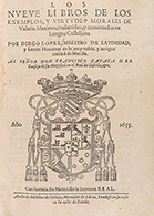 Varios errores de foliación pero obra completa. Portada con bonito escudo xilgráfico. [Sigue]: COMENTO SOBRE LOS NUEVE LIBROS DE LOS EXEMPLOS... Id. 1654. 159 fol. + 6 h. Portada propia. Capitales y culs-de-lampe xilografiadas. Texto con apostillas marginales. Enc. en pergamino de época, lomera rotulada, guardas con manuscrito de época. CCPB 42717-9.