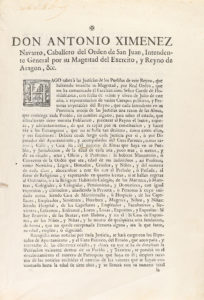 1786-1787. FOLLETO: (CENSO). DON ANTONIO XIMENEZ NAVARRO, caballero del orden de San Juan, intendente General por su Magestad del exercito, y Reyno de Aragon, &c. Folleto de 6 hojas, escritas en recto y verso, cuatro de ellas impresas y dos...
