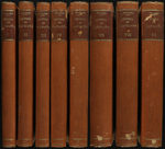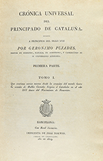 2 h. + 309 p. IV: 2 h. + III p. + 346 p. V: 5 h. + X p. + 15 h. (de índice) + 365 p. VI: VII p. + 491 p. VII: 2 h. + 567 p. VIII: 2 h. + IX + 536 p. Ocho vol. enc. en media tela, tejuelo; lomeras de tres vol. con pequeña falta pero enc. sólida. Es la edición más completa y mejor editada de las tres partes de la Crónica de Cataluña escrita por G. Pujades. La primera parte abarca desde la ´creación del Mundo´ hasta el año 914; la segunda parte del año 802 al 914 (dominación árabe); y la tecera parte, desde Wifredo II hasta Ramon Berenguer IV y Petronila. Palau 241874.