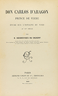1889. LIBRO: (HISTORIA). DESDEVISES DU DEZERT, G.: DON CARLOS D´ARAGON PRINCE DE VIANE. ÉTUDE SUR L´ESPAGNE DU NORD AU XVe SIÈCLE. Paris: Armand Colin et Cie. edit., 1889. 8º mayor. 455 p. Enc. en pasta española, tejuelo. Lleva una antigua...