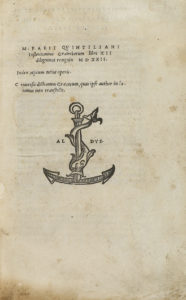 aedibuns Aldi, et Andreae Soceri mense ianurio, 1521 (en colofón). 8º mayor. 4 h.+ 230 fol. Tipografía cursiva llamada ´aldina´. Marca del impresor grabada en madera en la portada y el dorso de la última hoja. Plena piel de cerdo sobre tabla s.XX. Ejemplar con anchos márgenes. Segunda edición aldina tan rara como la primera (1514). Bella impresión y ejemplar. Palau anota: ´Segunda edición aldina igual a la primera, salvo la cuarta hoja preliminar que en vez de ser blanca encierra la traducción de fragmentos griegos, como ya se indica en el título, comprendidos en los escritos de Quintiliano´. Palau 245139.