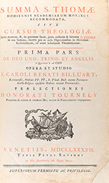 1787. LIBRO: (TEOLOGÍA). BILLUART, F. CAROLI RENATI: SUMMA S. THOMAE HODIERNIS ACADEMIARUM MORIBUS ACCOMMODATA, SIVE DURSUS THEOLOGIAE... Venetiis: Typ. Petris Savioni, 1787. 3 vol. en Folio mayor. I: 325 + 336 p. Dos partes con portada propia, la...