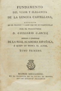 1796. LIBRO: (LINGÜÍSTICA). GARCÉS, GREGORIO: FUNDAMENTO DEL VIGOR Y ELEGANCIA DE LA LENGUA CASTELLANA. Madrid: Imp. de la Viuda de Ibarra, 1791. 2 tomos en 1 vol. 8º mayor. I: 2 h. + XXXII+288 p. II: portada+ XXXII + 324 p. Enc. en media piel,...