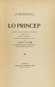 1920. LIBRO: (POLÍTICA). MACHIAVELLI, N.: LO PRÍNCEP. Trad. J. Pin y Soler. Barcelona: Imp. Henrich y Companyia, 1920. 4º menor. LXXXII + 188 p. + 3 h. + 4 lám. Rústica edit.