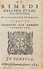 culs-de-lampe xilografiadas. Obra filosófica de Petrarca, formado por dos libros de diálogos. Galería en el margen inferior de algunas h. del segundo libro, antiguo y ocasional cerco de humedad. Enc. en pleno pergamino rígido de época parcialmente abierta, lomera rotulada. Antiguas anotaciones manuscritas.