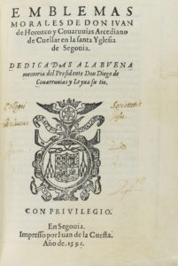 1591. LIBRO: (LITERATURA). HOROZCO Y COVARRUVIAS, JUAN DE: EMBLEMAS MORALES. DEDICADAS A LA BUENA MEMORIA DEL PRESIDENTE DON DIEGO DE COVARRUVIAS Y LEYVA SU TIO. Segovia: Impresso por Juan de la Cuesta, 1591. 8º mayor. 311 fol. (falto de los 3...