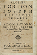 1626. LIBRO: (SÁTIRA INGLESA). BARCLAY, JOHN; PELLICER DE SALAS Y TOBAS, IOSEPH [Trad.]: ARGENIS. Madrid: Por Luis Sanchez, 1626. 1 vol. en 8º mayor. 6 h. + 454 fol. Error de foliación, de fol. 342 pasa a 369; sign. *6, A-Z8, 2A-2T8, 2V6, 3A-3K8,...