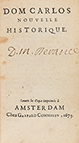 1673. LIBRO: (LITERATURA HISTÓRICA). [SAINT-REAL, CESAR VICHARD DE]: DOM CARLOS. Nouvelle historique. Amsterdam: Chez Gaspar Commelin, 1673. 8º menor. 2 h. + 212 p. Enc. en pasta española ligeramente rozada, marcos dorados en ambos planos, lomera...