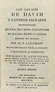 1796. LIBRO: (LITERATURA HEBREA). LALLEMANT, P.: LOS SALMOS DE DAVID Y CÁNTICOS SAGRADOS INTERPRETADOS EN UNA BREVÍSIMA PARÁFRASIS EN SENTIDO PROPIO Y LITERAL. Madrid: Imp. Real, 1796. 8º. Grabado en el frontis. + 1 h. + XXI + I510 p. + 17 h....