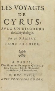 1827. LIBRO: (LITERATURA). RAMSAY, M.: LES VOYAGES DE CYRUS. AVEC UN DISCOURS SUR LA MYTHOLOGIE. Paris: Chez Gabriel-François Quillau, 1727. 2 vol. 8º menor. I: 8 h. (frontis grabado incluido) + 355 p. II: 1 h. + 188 p. Algún cerco de humedad. Dos...