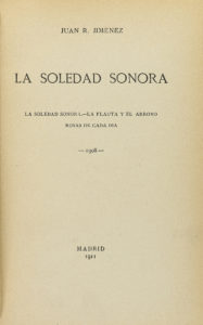 1911. LIBRO: (LITERATURA-MODERNISMO). JIMÉNEZ, JUAN RAMÓN: LA SOLEDAD SONORA. La soledad sonora.- La flauta y el arroyo.- Rosas de cada día. 1908. Madrid: Tipografía Revista de Archivos, 1911. 8º. 240 p. Núcleo ecléptico de la obra de juventud...