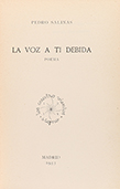 1933. LIBRO: (LITERATURA-GENERACIÓN 27). SALINAS, PEDRO: LA VOZ A TI DEBIDA. POEMA. Madrid: Imp. S. Aguirre, 1933. 8º. 186 p. + 4 h. PRIMERA EDICIÓN del poemario más célebre de Salinas. Enc. editorial con lomo en tela y planos en cartoné...