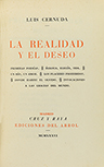 1936. LIBRO: (LITERATURA). CERNUDA, LUIS: LA REALIDAD Y EL DESEO. Madrid: Cruz y Raya, Edidiones el Árbol, 1936. 8º. 212 p. + 5 h. Contiene sus dos obras anteriores: Primeras poesías [Perfil del aire] y Dónde habite el olvido...