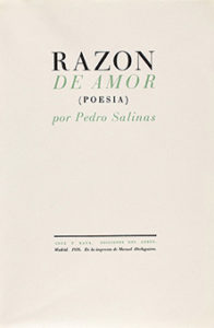 1936. LIBRO: (LITERATURA). SALINAS, PEDRO: RAZON DE AMOR (POESIA). Madrid: Cruz y raya; Ed. del Arbol, Imp. Manuel Altolaguirre, 1936. 4º menor. 236 p. + 3 h. PRIMERA EDICIÓN. Rústica editorial con protección; pequeña rasgadura en la lomera.