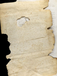 público de Girona Francesc Simó en septiembre de 1331. Es la herencia de la masía Mir, con todas sus tierras y derechos, a favor de Joan Ramon Mir, hijo de Joan Mir y Guillerma. El segundo documento de 48 x 31 cm, con alguna falta en los márgenes que afecta principios y finales de línea, así como una pérdida al final del documento que afecta varias líneas. Dado en 1351 en Girona ante el notario Pere Banyils. Es una venta perpetua de una pieza de tierra situada en la parroquia de Fontcoberta y que Pere Rech realiza a favor de Bernat Fuster, ambos de la misma parroquia.