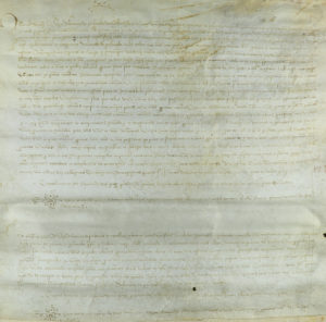 1347-1348, 1384. MANUSCRITO: (PERGAMINO-GIRONA). TRASLADO DE DOS DOCUMENTOS NOTARIALES MANUSCRITOS SOBRE UNA VENTA. Pergamino manuscrito en latín. 40 x 38,5 cm. Venta censal del Sr. del castillo de Palol del Mas Seguer. Signum notarial de...