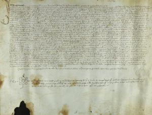 1423. MANUSCRITO: (PERGAMINO-GIRONA). DOCUMENTO NOTARIAL MANUSCRITO SOBRE EL TESTAMENTO DE NICHOLAUS MASFORDI DE PALANOLO [PALOU]. Manuscrito en latín con capital decorada. 31,5 x 42,5 cm. Documento referente al testamento de Nicholaus Masford de...