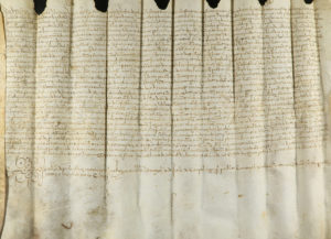 1512. MANUSCRITO: (PERGAMINO-GIRONA). DOCUMENTO NOTARIAL MANUSCRITO SOBRE UNA HERENCIA DE BARTHOLOMEO MASFORD DE PALANOLO [PALOL]. Manuscrito en latín, capital decorada. 30 x 471 cm. Documento referido a una herencia de Bartholomeo Masford de...