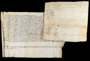 de 50 libras en moneda barcelonesa, correspondientes a las legítimas paterna y materna, en concepto de dote a Anna, hija de Baldiri Pararols, de la parroquia de Mieres. El segundo, de 20 x 22 cm, firmado ante el notario Miquel Olives en 1556. Se trata de una venta y ápoca de pago realizada por Antonio Simón, payés de Masarac, de la parroquia de Peralada.