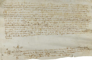 1544. MANUSCRITO: (PERGAMINO-GIRONA). DOCUMENTO MANUSCRITO REFERENTE A LA FAMILIA MASCORT. Manuscrito en latín. 16 x 26 cm. Posible ápoca de Gabriel Tolosa alias Mascort y su mujer propietarios de Mas Mascort. Signum notarial de Petrus...