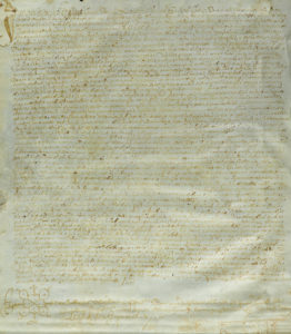 1569. MANUSCRITO: (PERGAMINO-GIRONA). DOCUMENTO NOTARIAL SOBRE UNAS TIERRAS AGRÍCOLAS DEL MAS MASCORT. Manuscrito en latín, letra capital decorada. 33 x 28,5 cm. Documento referente a unas tierras agrícolas del Mas Mascort de propiedad de...
