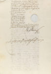 cm, escritos en recto y verso. Descripción y aceptacion de un préstamo realizado por Octavio Centurión de varios millones en plata. El sello ha sido recortado en todo el documento. Firmado por el notario Fernandez de Valencia. Comentarios manuscritos de la segunda mitad del s. XVII en las dos primeras h. Presentados en una carpeta de papel verjurado.