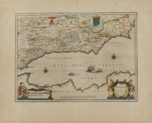 1640 ca. MAPA: [BLAEU:]. GRANATA ET MURCIA REGNA. Mapa calcográfico sobre papel verjurado. 38 X 50 huella, 53,5 x 63,5 cm papel. Límites y cartelas iluminadas. Texto al dorso en latín.