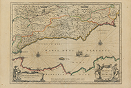 1640 ca. MAPA: (GRANADA-MURCIA). [BLAEU:]. GRANATA ET MURCIA REGNA. Mapa calcográfico sobre papel verjurado. 38 x 49,5 huella, 47 x 59 papel. Límites y cartelas iluminadas a mano. Texto al dorso en neerlandés. Margen superior e inferior doblado....