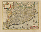 1647 ca. MAPA: (CATALUNYA). [JANSSONIUS:]. CATALONIA. Mapa grabado al cobre, límites y cartelas coloreados. 38,5 x 48,5 cm huella, 45 x 54,5 cm papel. Coloreado de época. Texto en letra gótica a dos columnas al dorso, en francés. Papel...
