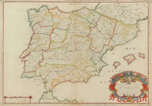 1658. MAPA: (ESPAÑA). SANSON, N.: CARTE GENERALE D´ESPAGNE ET DE TOUS LES ROYAUMES... Paris: Melchior Tavernier y Pierre Mariette, 1658. 41,5 x 57,5 cm, margen superior e inferior doblados. Mapa grabado al cobre, límites coloreados de época y...