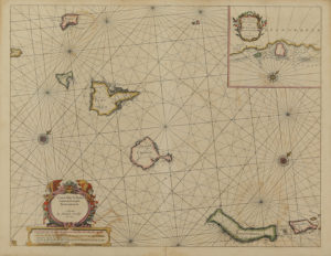 1664. MAPA: (CARTA NÁUTICA-CANARIAS). DONCKER, HENDRICK: CANARISCHE EYLANDEN CANARIA, TENERIFA, FORTEVENTURA. Amsterdam. Mapa calcográfico sobre papel verjurado. Huella: 44 x 53,5 cm; papel: 46 x 58 cm. Bellamente iluminado a mano de época....