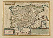 1670 ca. MAPA: (PENÍNSULA IBÉRICA). HONDIUM, HENRICUM: HISPANIAE VETERIS DESCRIPTIO. Amstelodami. Mapa grabado de 37,5 x 49,5 huella, 42 x 55,5 cm papel. Bonito coloreado, algo posterior, papel ligeramente tostado. Gran cartela con texto, en...