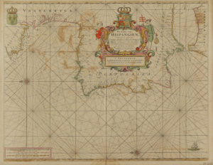 [1673]. MAPA: (CARTA NÁUTICA-COSTA OESTE PENÍNSULA IBÉRICA). DONCKER, HENDRICK: PAS CAART VAN HISPANGIEN VERTOOMENDE DE CUSTEN VAN GRANADE, ANDALUZIE, ALGARVE, PORTUGAEL, GALSCIEN EN BISCAIEN MET EEN GODEELTE VAN VRANCKRYCK, STRECKENDE VAN...