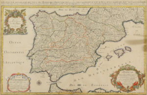 VALENCE ET MAIORQUE ET LES PRIN.tés D´ASTURIES, BISCAYE ET CATALOGNE. París: Chez H. Iaillot, 1689. Dos grandes hojas unidas, 60 x 89 cm huella, 62 x 90 cm papel. Bonito coloreado. Tres leyendas, una con la dedicatoria al Delfín de Francia, otra con el título del mapa y los datos de la impresión y otra con las escalas. Margen inferior irregular. Refuerzo en la parte inferior del doblez central.