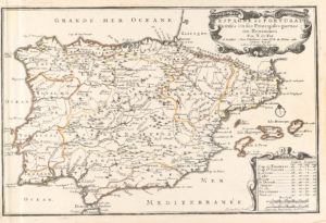 1705. MAPA: (PENÍNSULA IBÉRICA). FER, N. DE FER: ESPAGNE ET PORTUGAL DIVISÉS EN SES PRINCIPALES PARTIES OU ROYAUMES. Paris: Chez l´Autheur. Grabado al cobre por H. van Loon. 24 x 35 cm. Límites coloreados. Lleva al dorso y sobrepuesta, la...